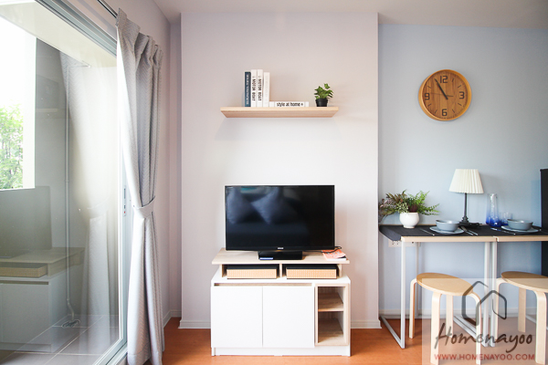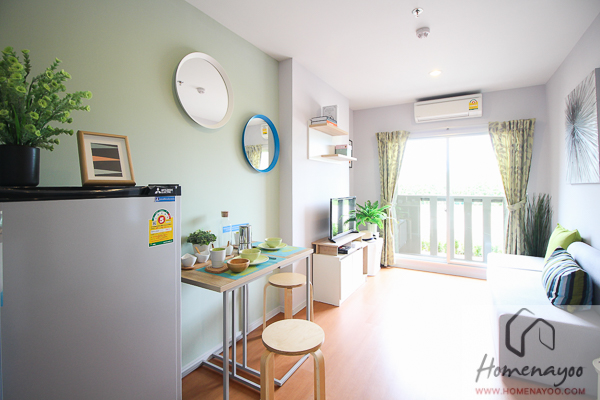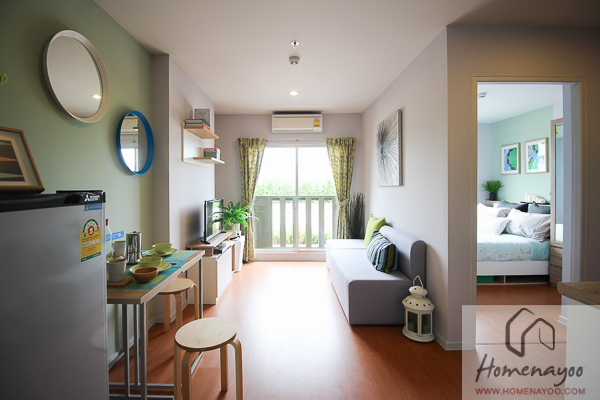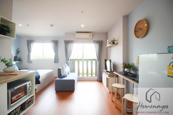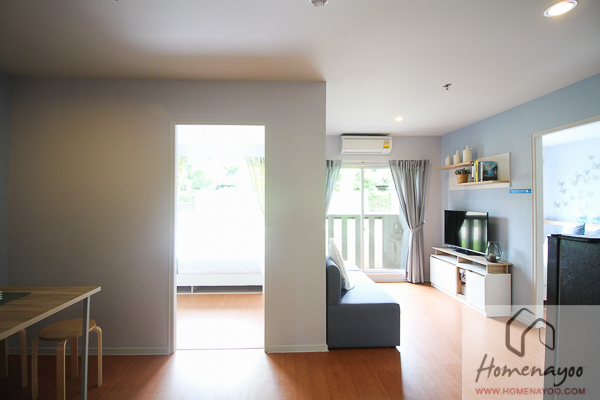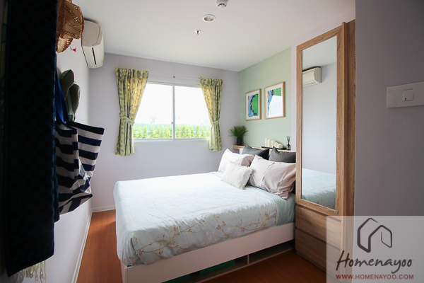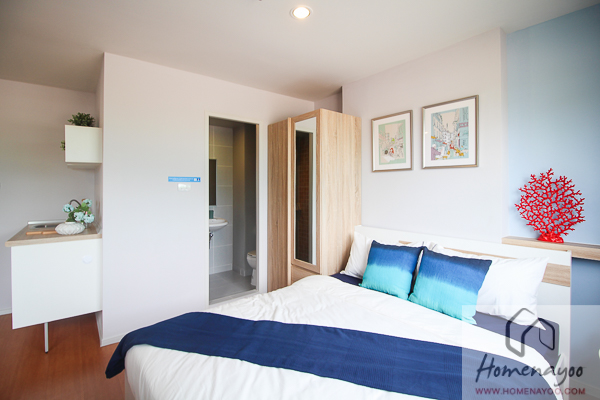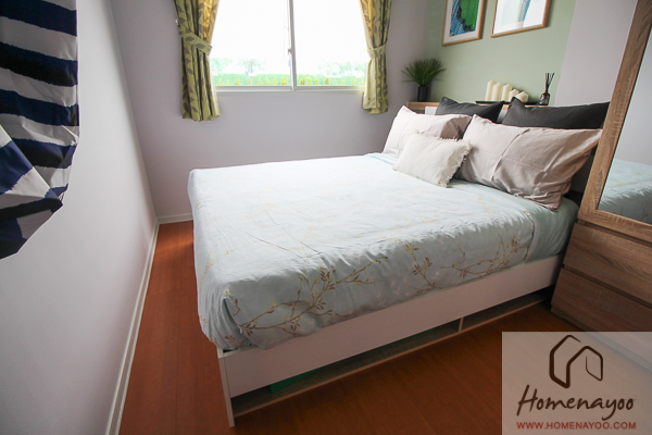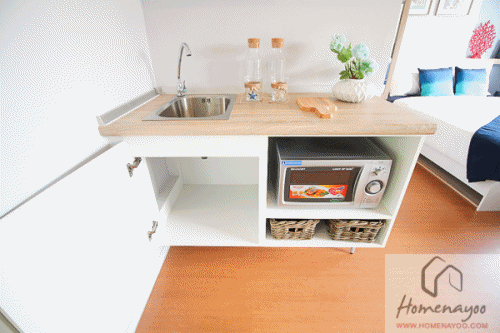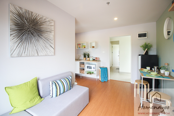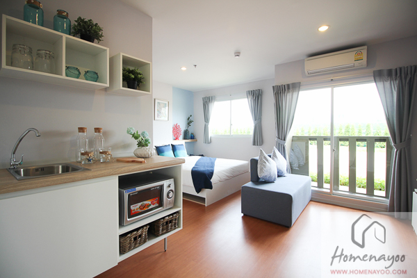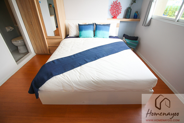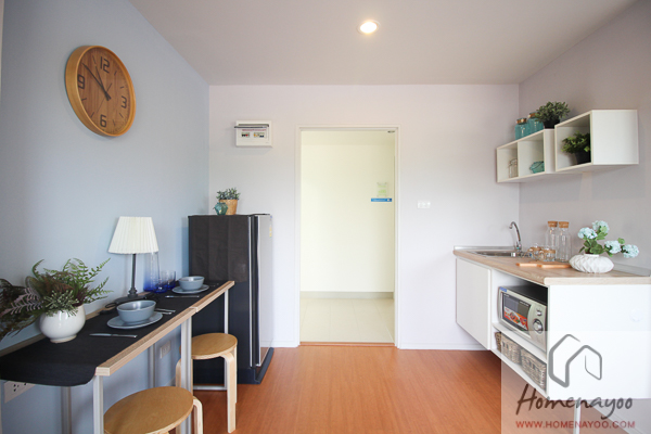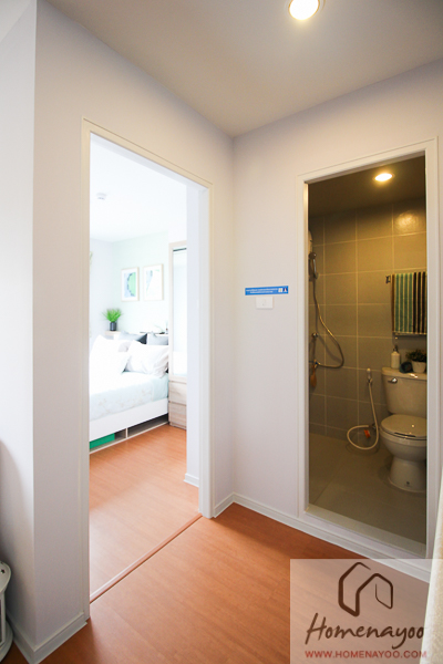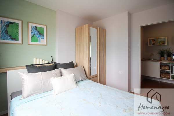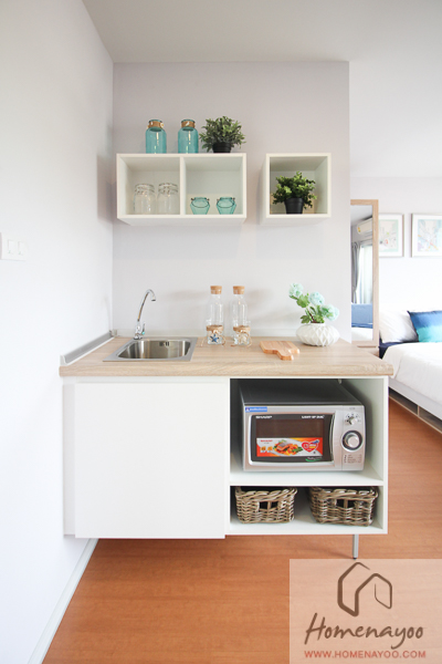 ในส่วนของห้องพักจะมีให้เลือก 3 แบบ โดยจะมีห้องขนาดตั้งแต่แบบ Studio, 1 Bedroom, 2 Bedroom แต่ว่าแต่ละ Type ก็จะมีขนาดที่ต่างกันอีก จากห้องตัวอย่างที่ไปดูมาคิดว่ามีการจัดพื้นที่ใช้สอยได้ดีนะคะ จัดแล้วห้องก็ยังดูโปร่งๆโล่งๆ เหมาะกับการพักผ่อน ครัวได้เป็นแบบครัวเปิดมีพื้นที่ติดกับประตูห้องนอน (ในห้อง 1 Bedroom และ 2 Bedroom )ซึ่งถ้าใครอยากจะกั้นส่วนครัวเป็นครัวปิดก็อาจจะลำบากหน่อยเพราะกั้นไปกลิ่นก็สามารถเข้าไปรบกวนในห้องนอนได้อยู่ดี ปล่อยเป็นครัวเปิดไว้ดูจะเหมาะสมกว่า