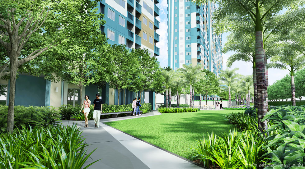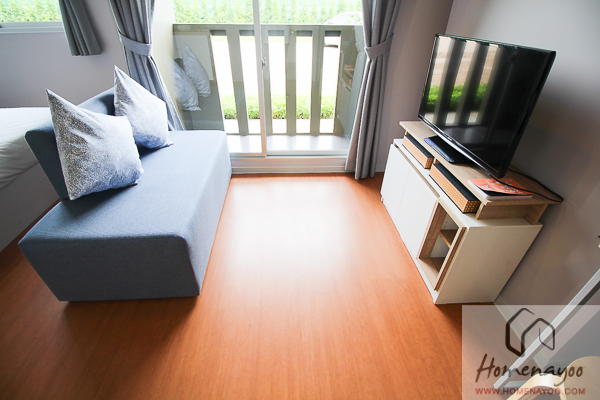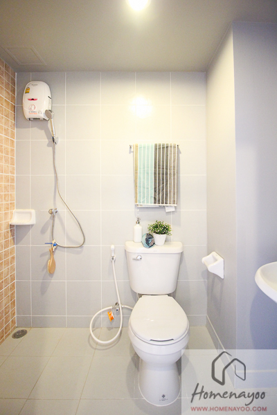 วัสดุ : วัสดุของโครงการนี้ใช้ของตาม Standard พื้นห้องทั่วไปปูด้วยลามิเนต, ห้องน้ำปูกระเบื้องเซรามิค, ผนังฉาบเรียบ ทาสี, ประตูและกระจกบานเลื่อนจะได้เป็นกรอบอลูมิเนียมสีธรรมชาติ แต่ได้ของแถมมาครบดีค่ะ ได้เคาน์เตอร์ครัว Top ลามิเนตพร้อมซิงค์ล้างจาน, โซฟารับแขก, ชั้นวางทีวี, ชุดโต๊ะทานอาหาร, ตู้เสื้อผ้า, โต๊ะข้างเตียง เครื่องใช้ไฟฟ้าก็มีเครื่องปรับอากาศและเครื่องทำน้ำอุ่น, ห้องน้ำมีแยกส่วนแห้งส่วนเปียกแต่ไม่มี Shower Box ให้นะคะ, อ่างล้างหน้าแบบฝังเคาน์เตอร์ของ American Standard, ฝักบัวอาบน้ำและโถสุขภัณฑ์ American Standard แบบครบชุด