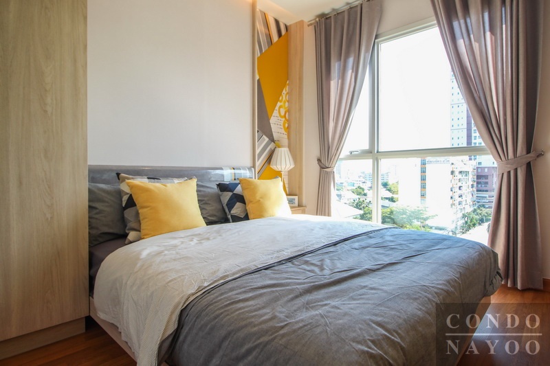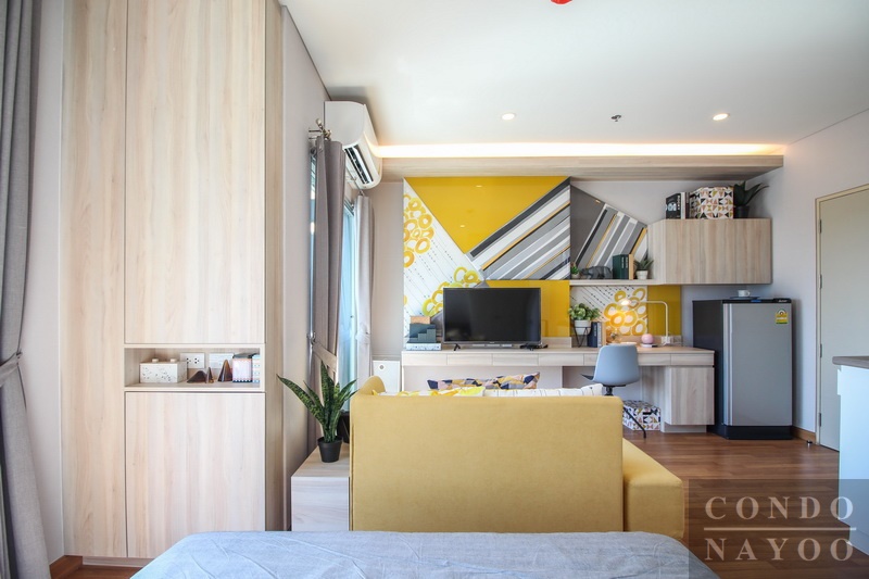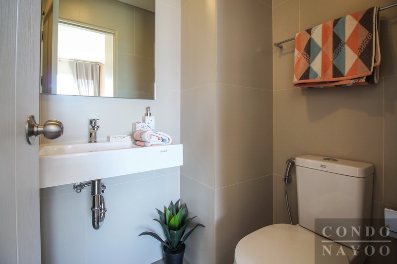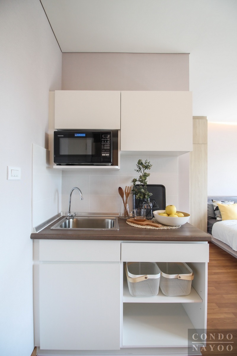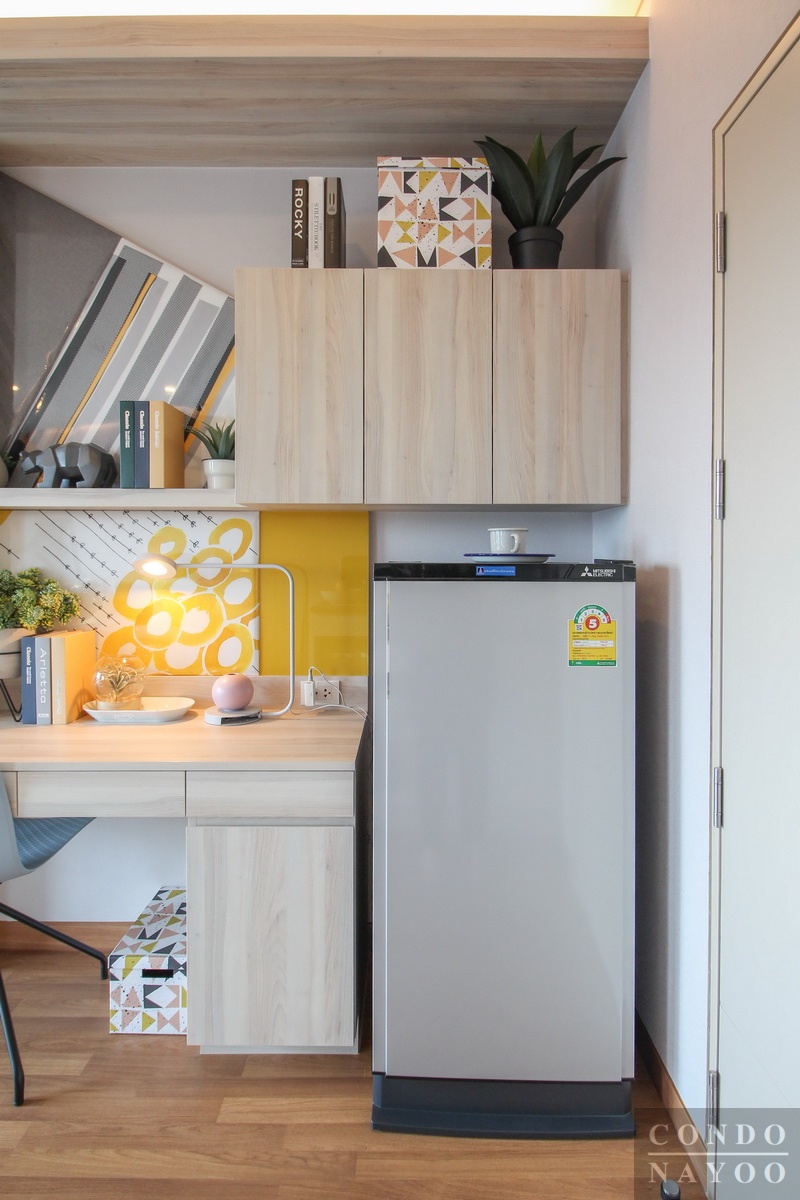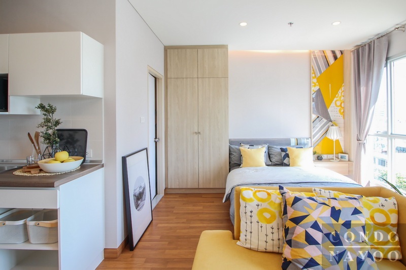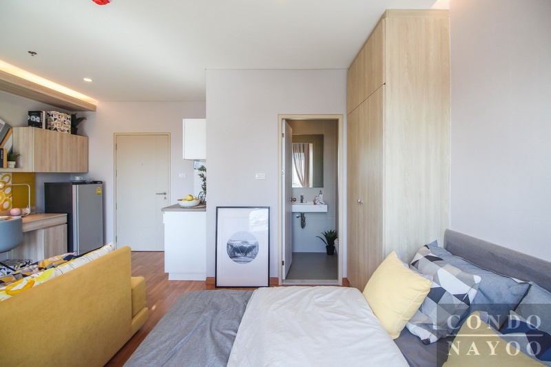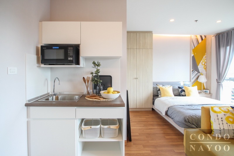 สำหรับแบบห้องที่ให้เลือกจะมีทั้งหมด 3 แบบ คือ ห้อง Studio ขนาดพื้นที่ใช้สอย 24.00 ตร.ม., ห้อง 1 Bedroom ขนาด 28.50 – 33.50 ตร.ม. และห้อง 2 Bedrooms ขนาด 53.00 ตารางเมตร (มีแค่ 6 ยูนิต) ส่วนฟังก์ชั่นภายในห้องพักใช้งานได้สะดวกตามลักษณะของแต่ละ Type โดยทุกห้องจะขายแบบ Fully Furnished พร้อมเข้าอยู่เลยค่ะ ความสูงฝ้าเพดาน 2.6 เมตร ปูพื้นด้วยลามิเนตลายไม้สีเข้ม เริ่มแรกเมื่อเข้ามาในห้องส่วนแรกเลยจะเป็นครัวแบบเปิดพร้อมเคาน์เตอร์ครัว