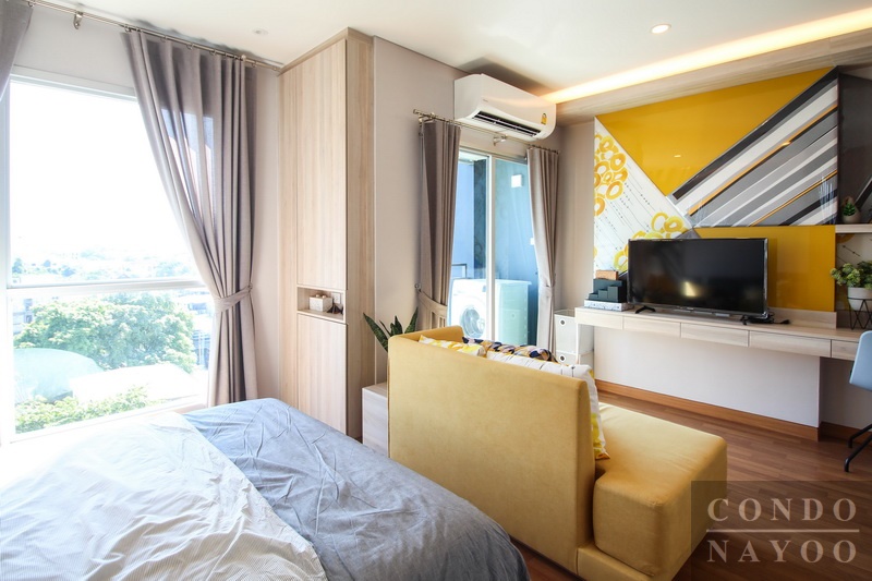 จากนั้นเป็นมุมรับประทานอาหารได้โต๊ะทานอาหารและชั้นวางทีวี เชื่อมไปยังห้องนั่งเล่น และพื้นที่ระเบียง ส่วนห้องนอนและห้องน้ำจะอยู่บริเวณใกล้ๆ กับห้องนั่งเล่นเลยค่ะ ในห้องนอนได้ตู้เสื้อผ้า ตู้เก็บของ ภายในห้องมีแสงสว่างเข้ามาเยอะจากหน้าต่างบานใหญ่ทั้งจากห้องนอนและห้องนั่งเล่น